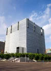 Exterior architectural photography of the angular, copper-toned facade of the Natural History Museum of Utah, featuring tiered horizontal paneling and large glass windows reflecting the sky by MANICPROJECT