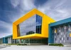 Low-angle architectural photography of a modern commercial building featuring a vibrant yellow geometric facade and grey textured paneling against a clear blue sky, captured by MANICPROJECT in Salt Lake City