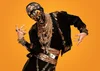 Maximalist fine art portrait by MANICPROJECT of a performance artist adorned in heavy gold chains and a jewel-encrusted headpiece against a vibrant yellow backdrop. This warm-toned study of opulence and power explores the construction of a modern deity, serving as a visceral centerpiece for avant-garde art collectors and bespoke private commissions seeking original narrative storytelling